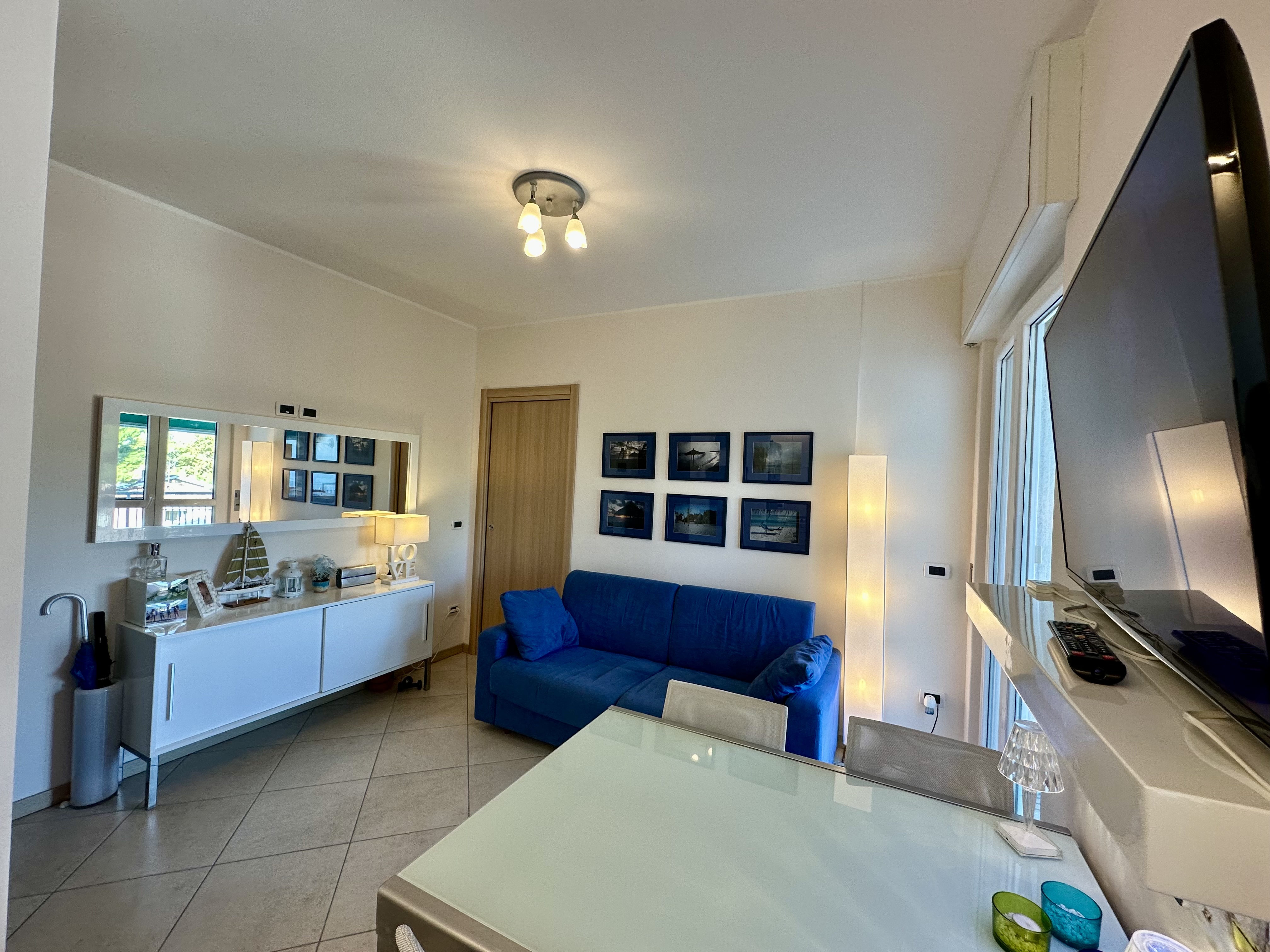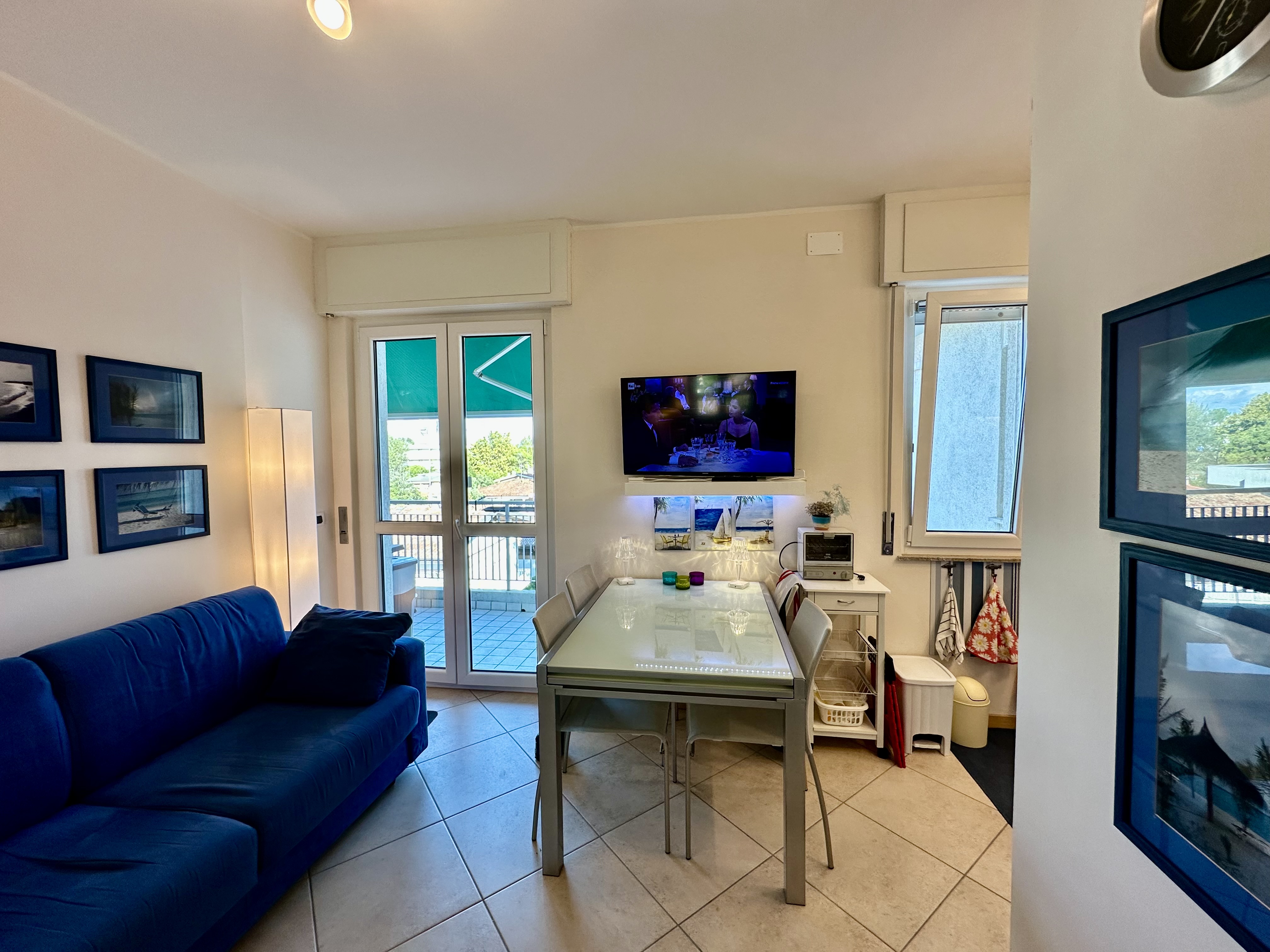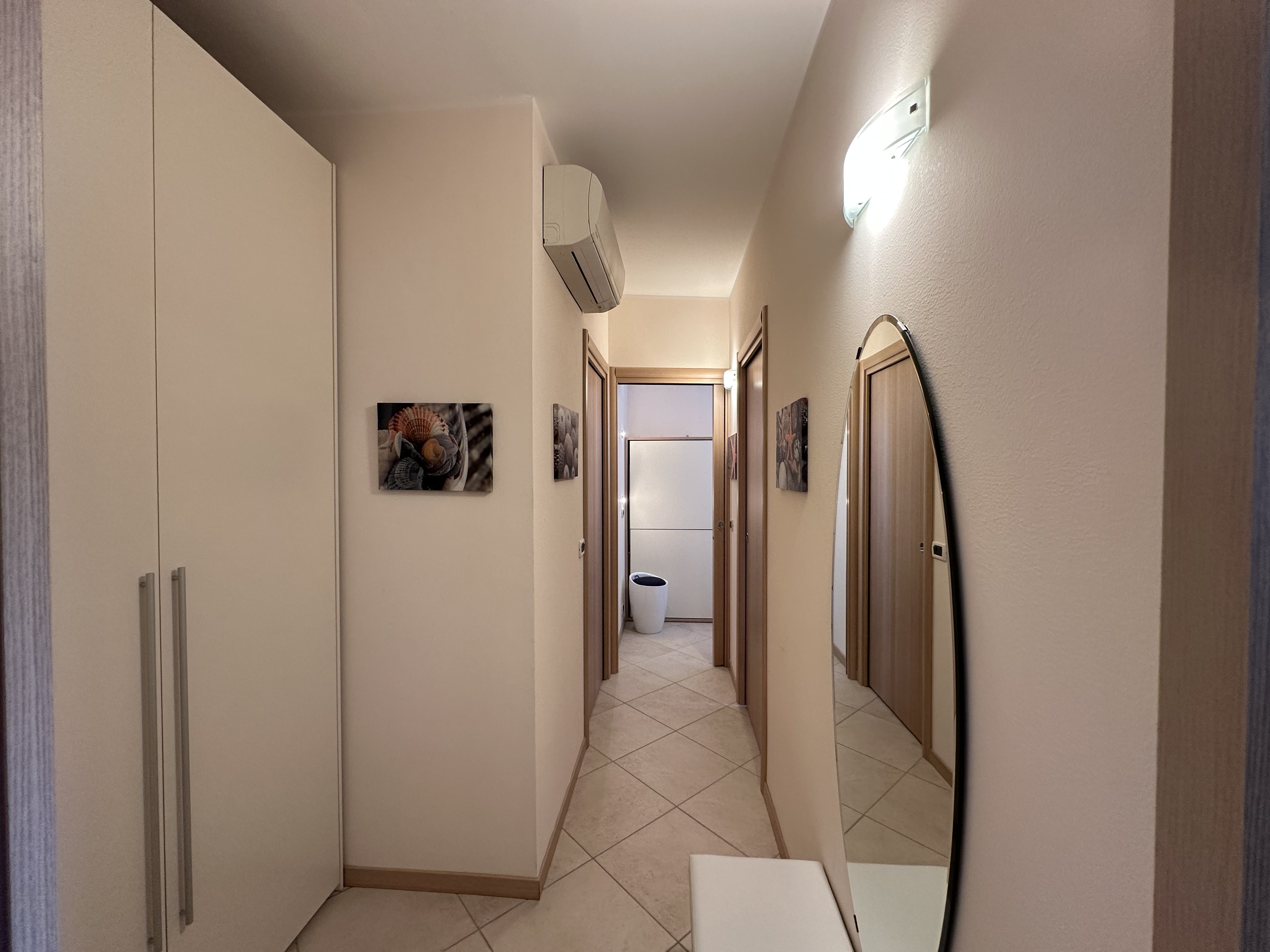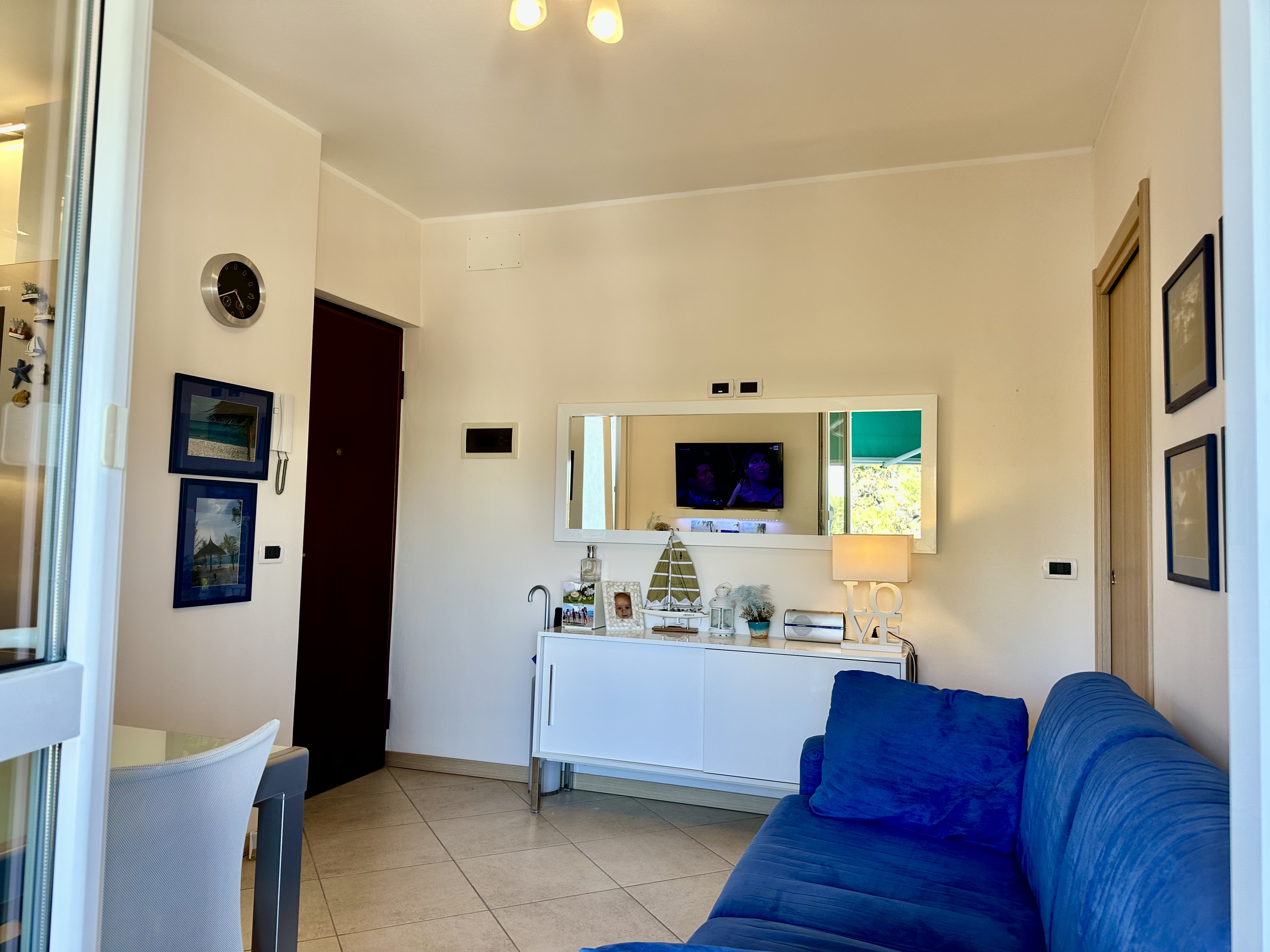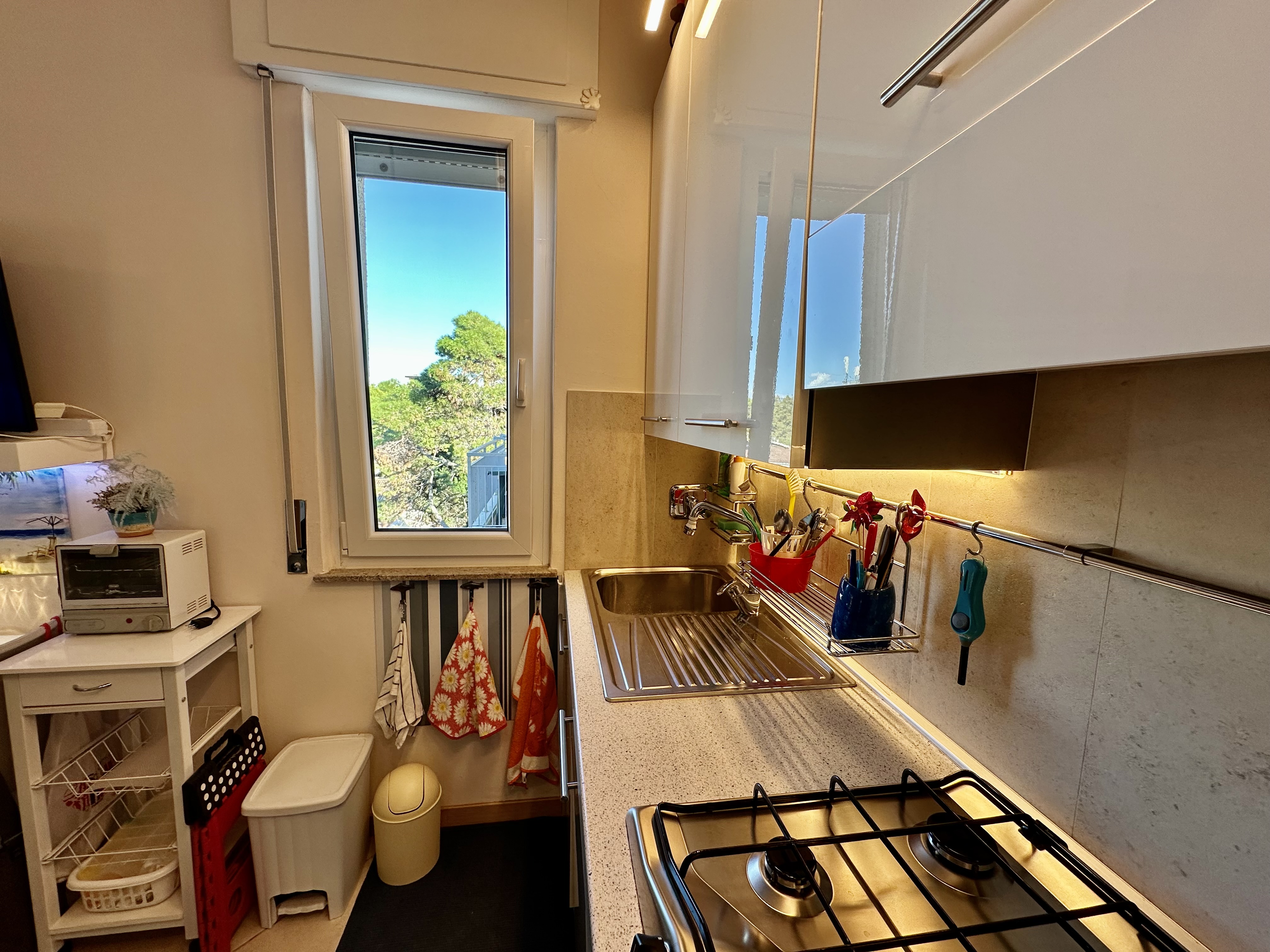 GRADO PINETA, front row, top-floor (4th) apartment with lift. Entrance hall, living room with access to the terrace, kitchen corner with window, hallway, double bedroom, relaxation room with access to a second terrace, bathroom/shower with window. Small outdoor laundry room. The apartment has been completely renovated. Air conditioning. Panoramic views of the pine forest and sea views from both terraces. Euro 225.000,00.