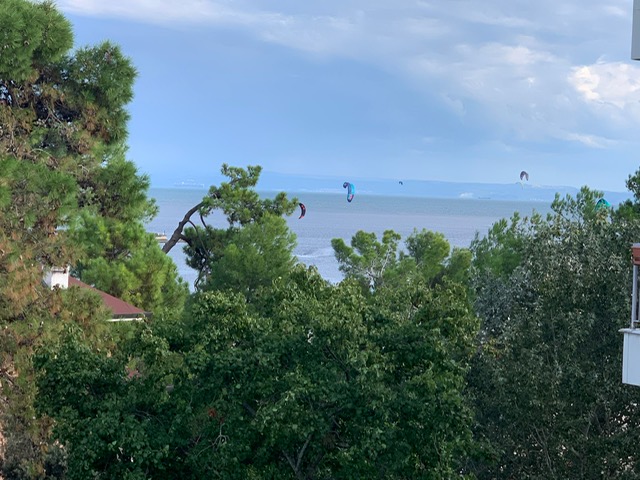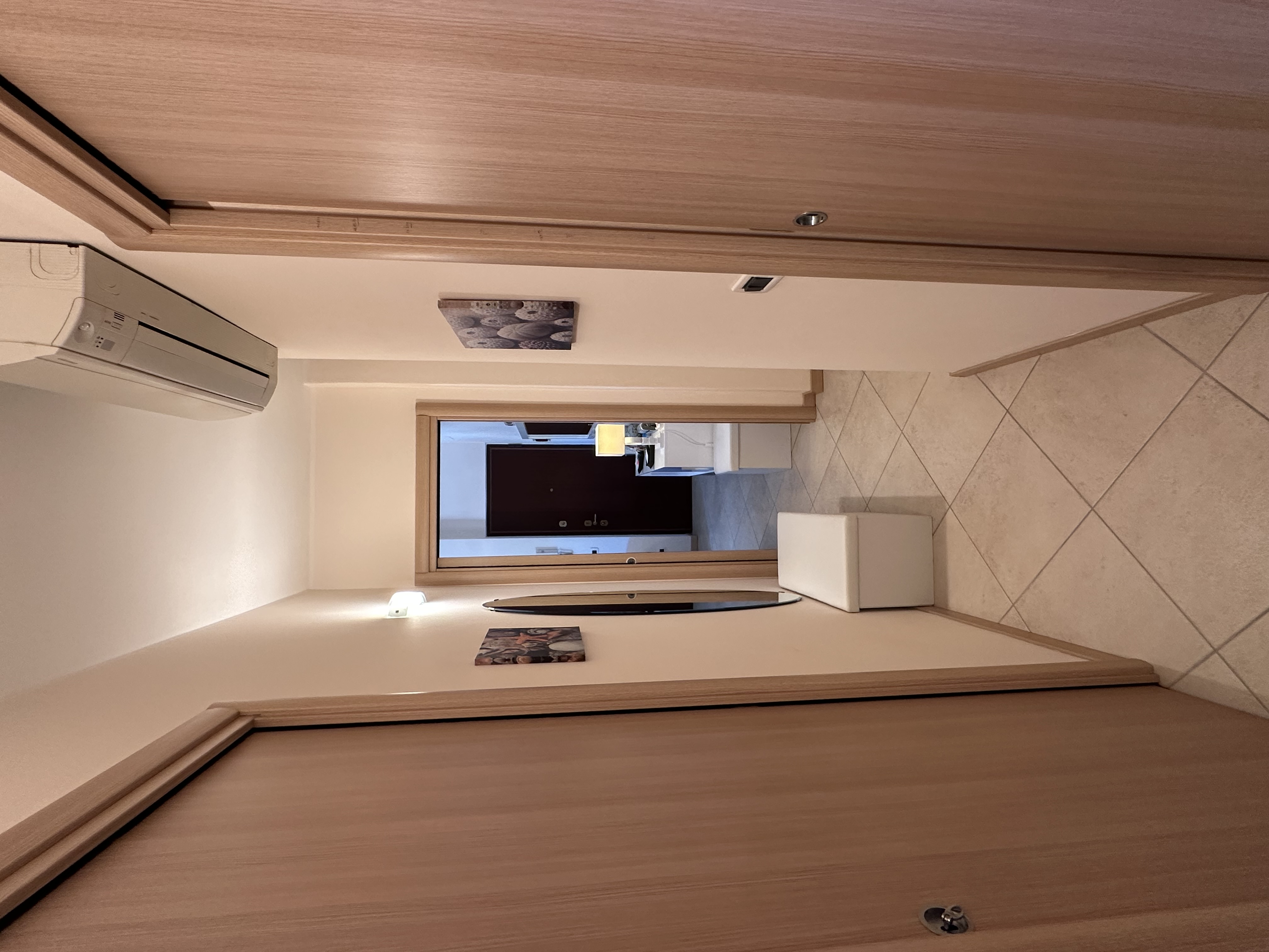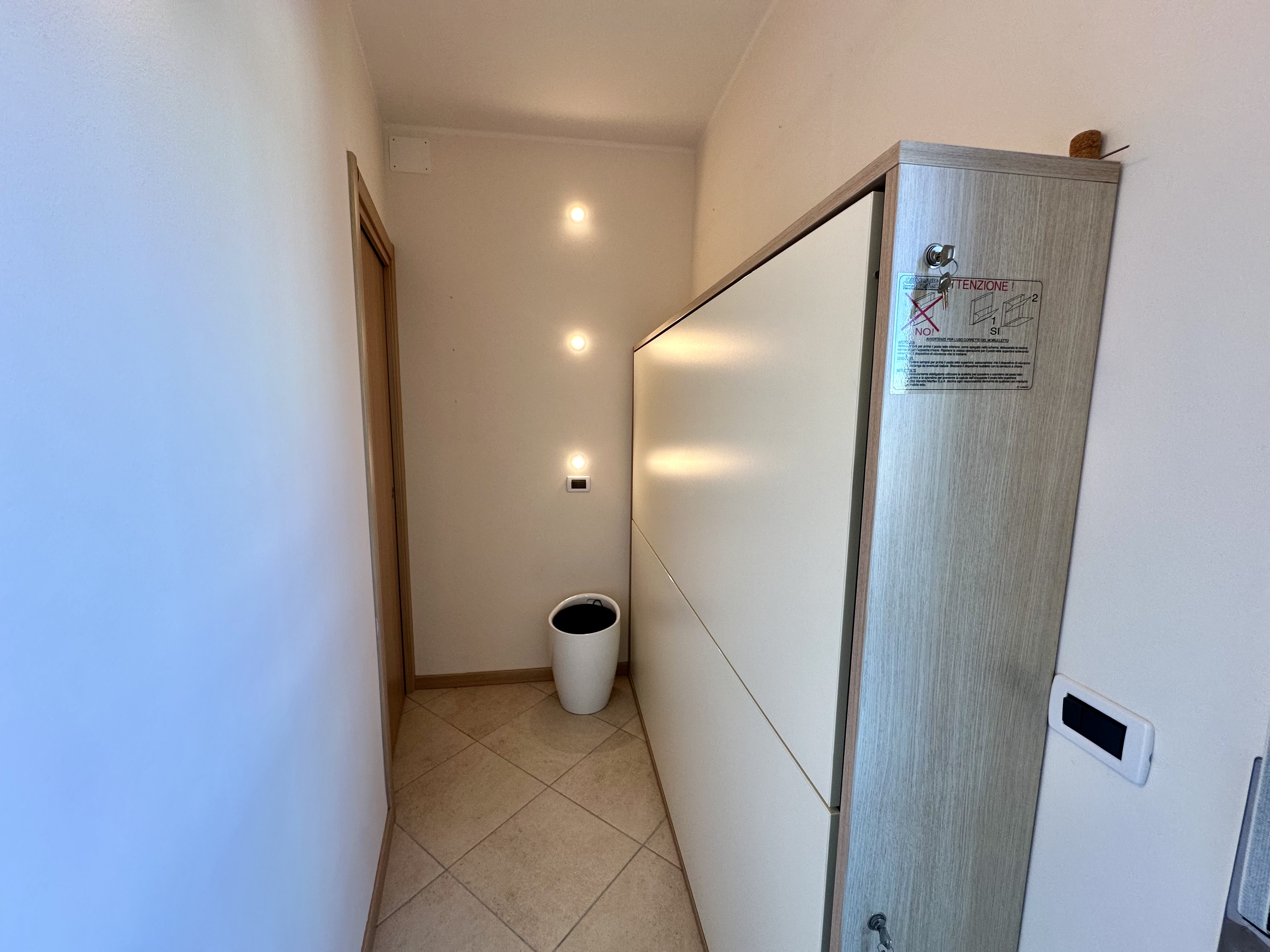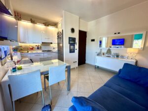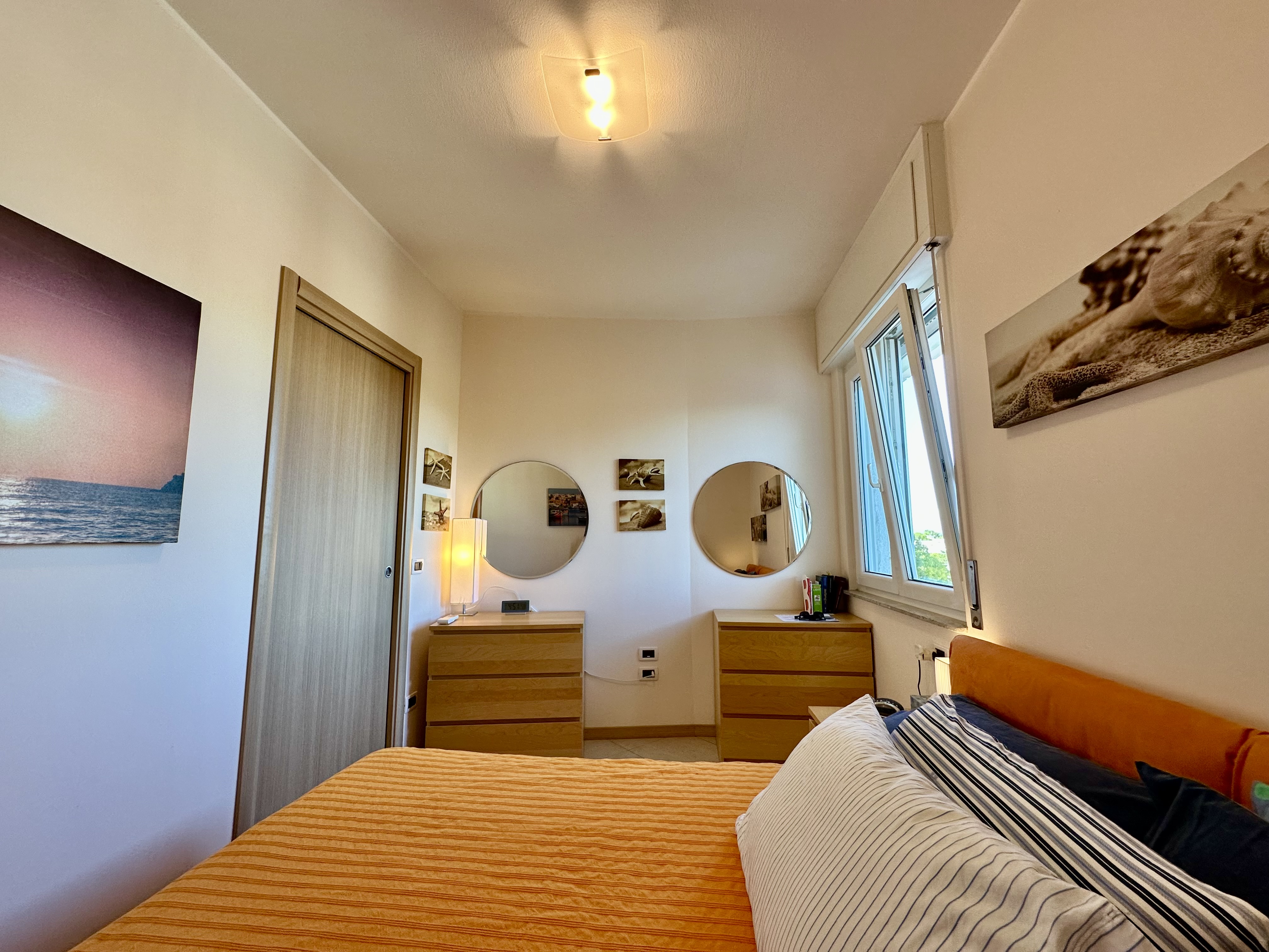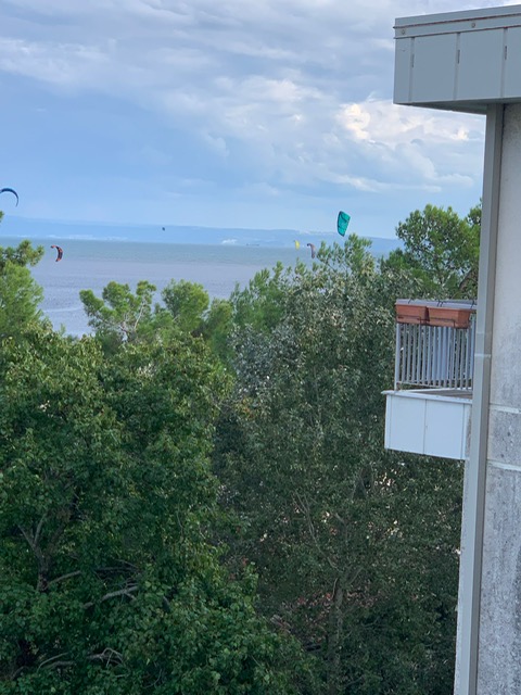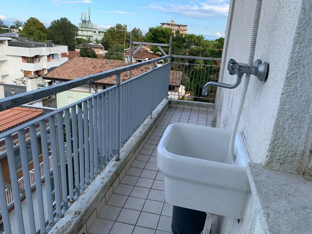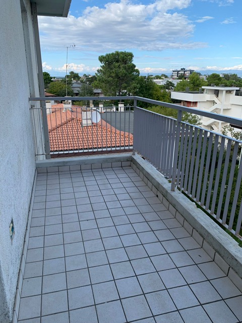 GRADO PINETA, front row, top-floor (4th) apartment with lift. Entrance hall, living room with access to the terrace, kitchen corner with window, hallway, double bedroom, relaxation room with access to a second terrace, bathroom/shower with window. Small outdoor laundry room. The apartment has been completely renovated. Air conditioning. Panoramic views of the pine forest and sea views from both terraces. Euro 225.000,00.