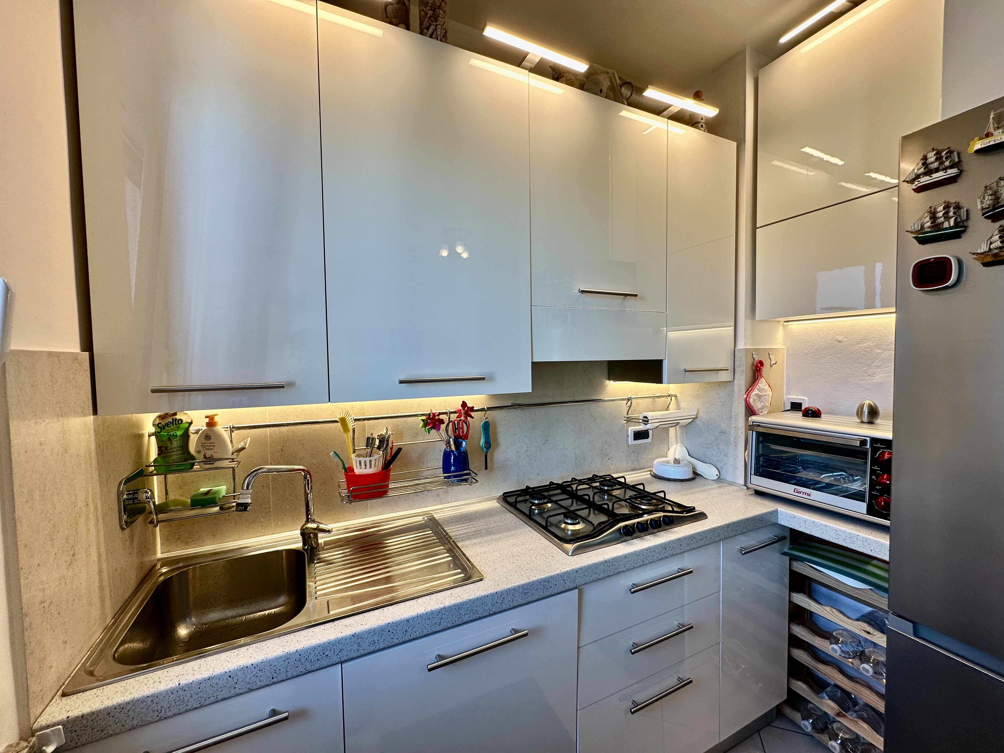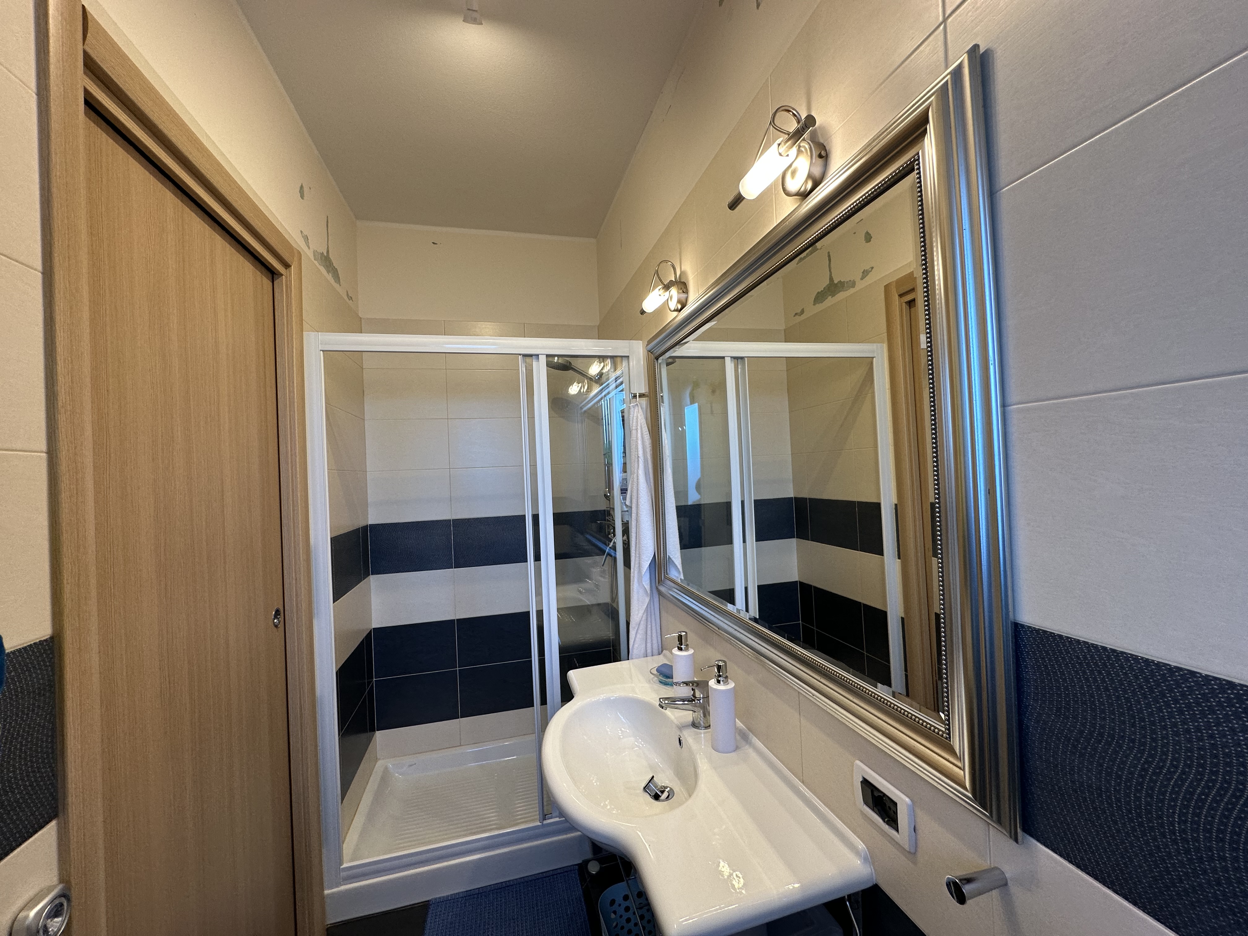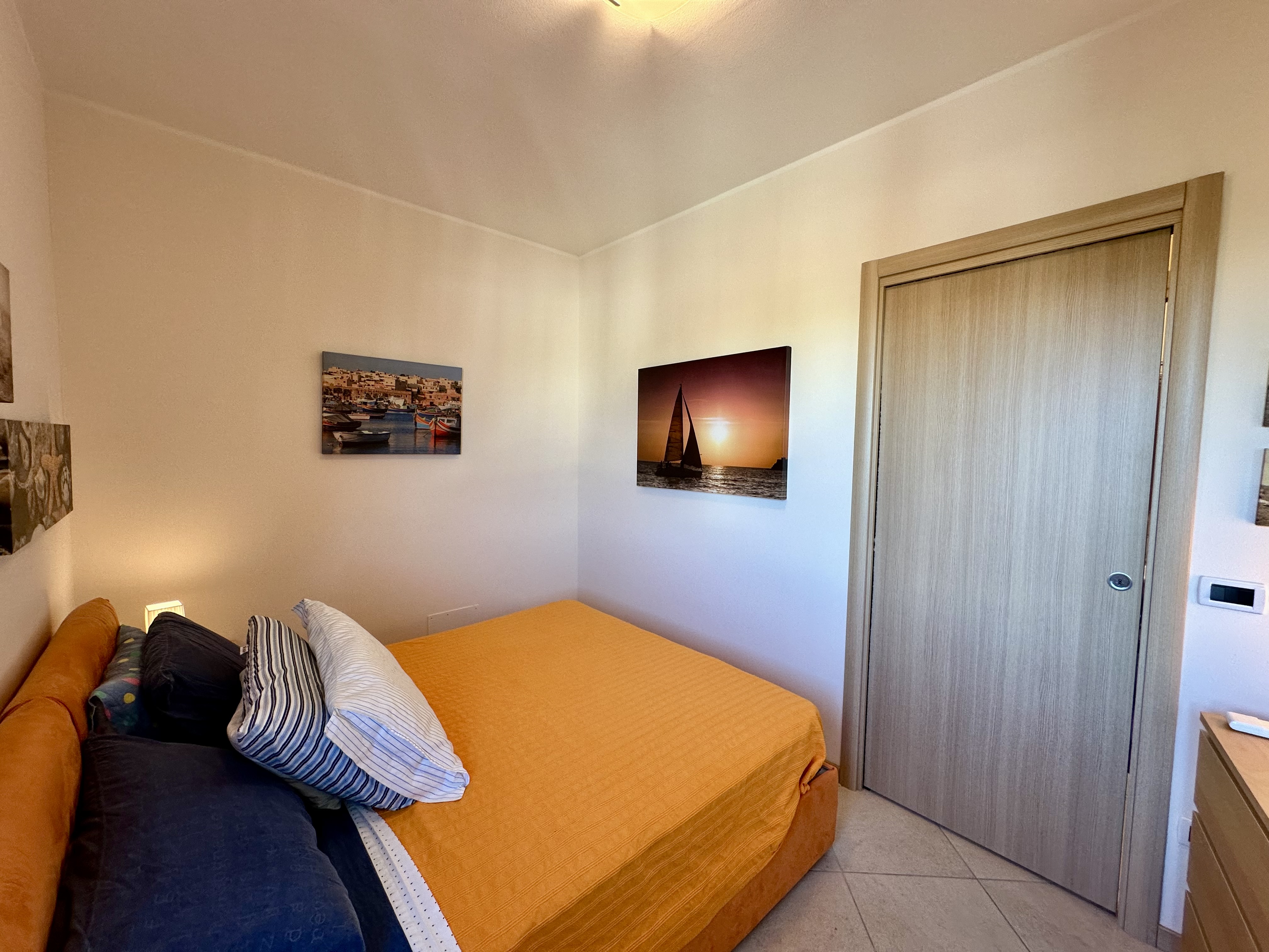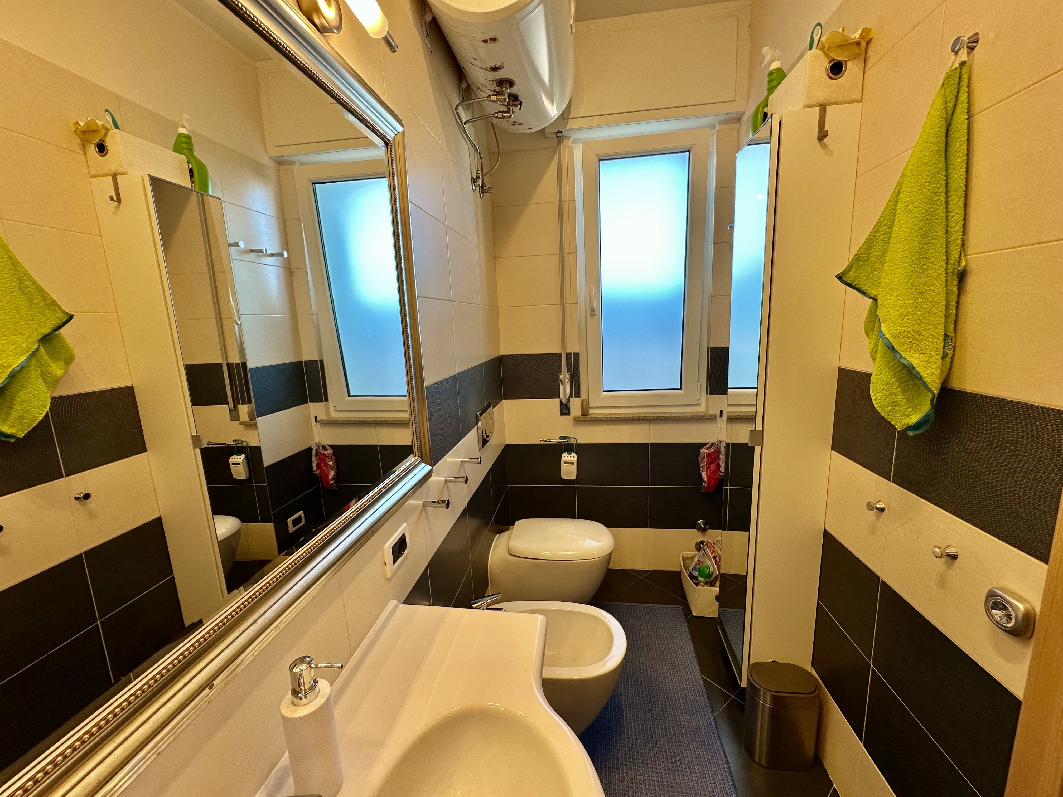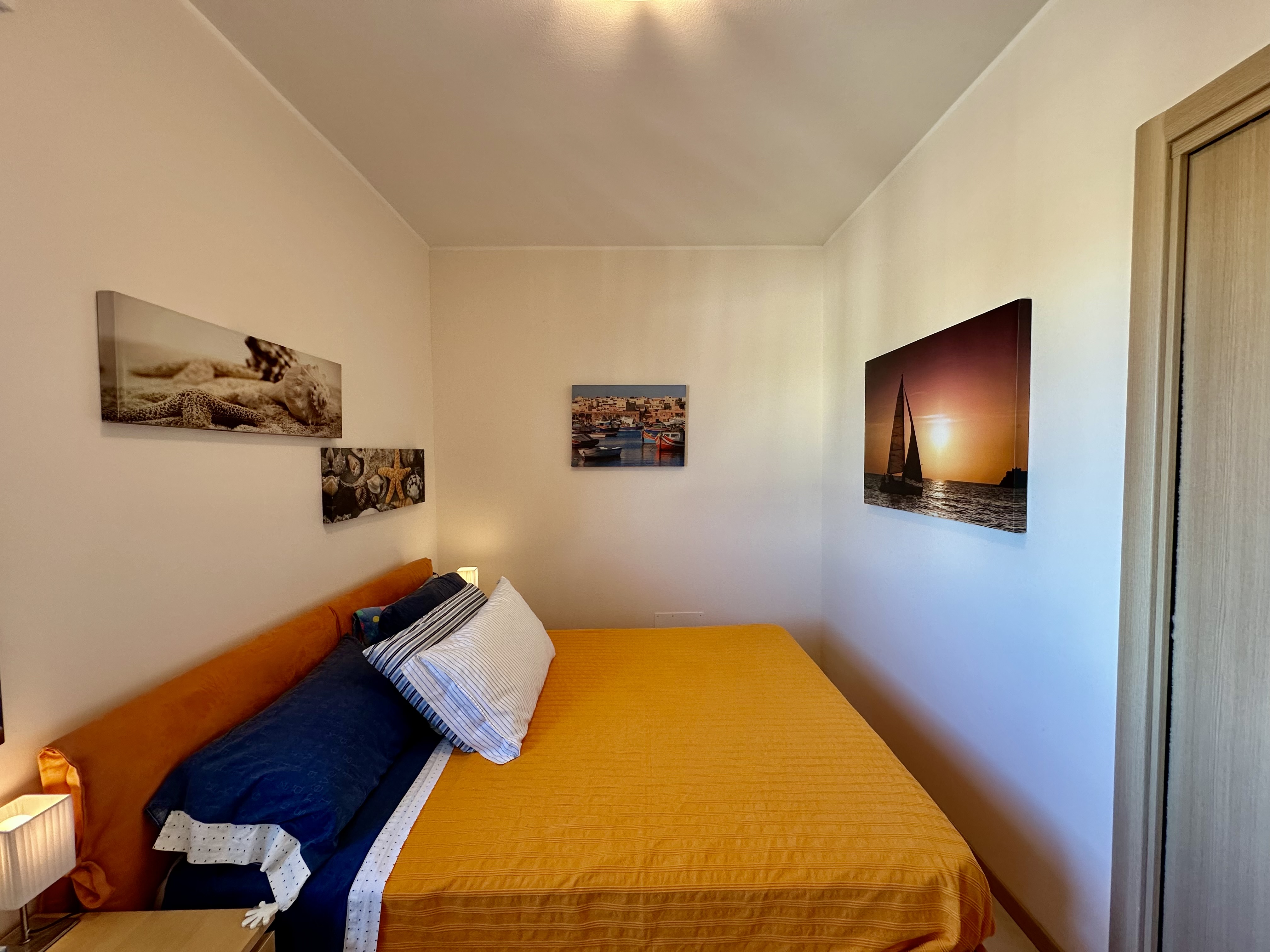 GRADO PINETA, front row, top-floor (4th) apartment with lift. Entrance hall, living room with access to the terrace, kitchen corner with window, hallway, double bedroom, relaxation room with access to a second terrace, bathroom/shower with window. Small outdoor laundry room. The apartment has been completely renovated. Air conditioning. Panoramic views of the pine forest and sea views from both terraces. Euro 225.000,00.